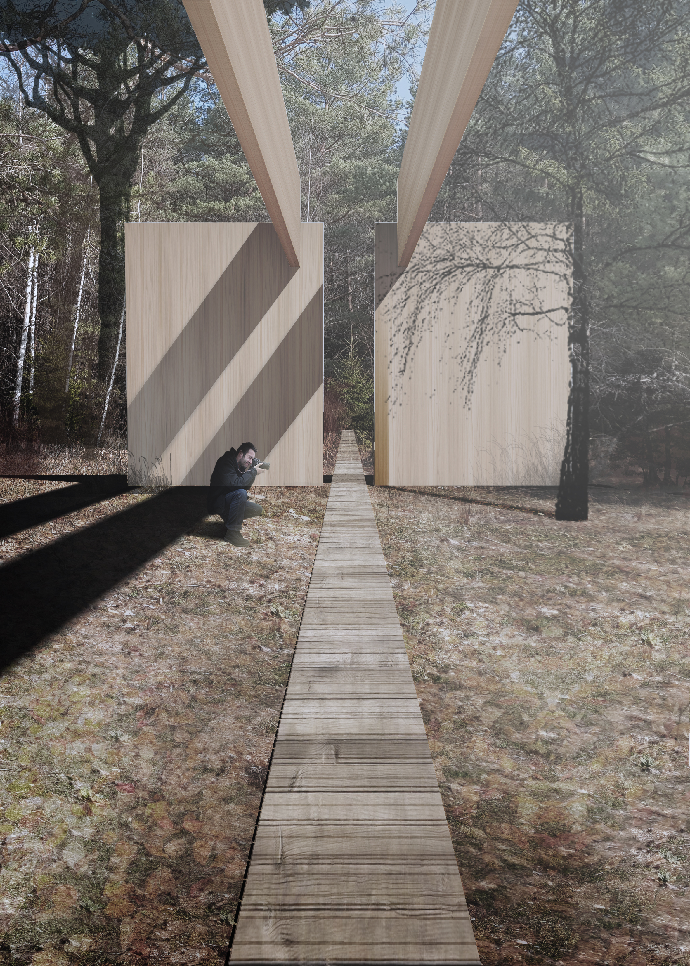 La nostra proposta di progetto è una metafora. Immaginiamo il centro per visitatori come un insediamento rurale diffuso, che dialoga con l’ambiente attraverso prospettive privilegiate e relazioni spaziali accennate capaci di capovolgere i punti di vista. Tre padiglioni in legno evocano il trittico “Passato - Presente - Futuro”. Questi sono connessi l’uno all’altro per mezzo di un sentiero che sollecita i sensi umani ad aprirsi in modalità diverse nei confronti della foresta. Il padiglione principale “Ora” ospita una sala espositiva con caffetteria e punto informazioni, una terrazza coperta e spazi per gli addetti ai lavori.